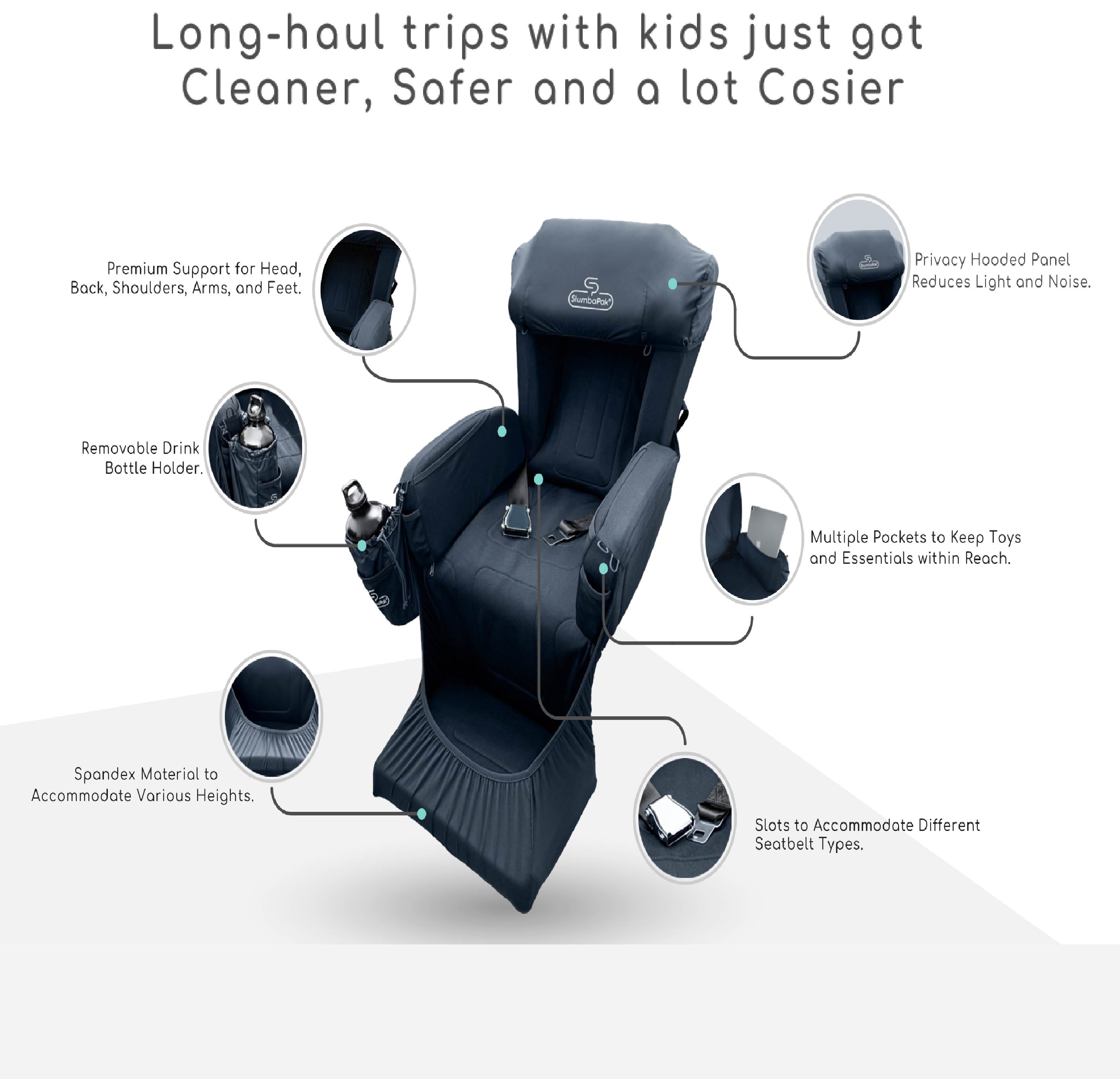 The patented design covers seat surfaces, including headrests and armrests, reducing direct contact with contaminated areas. The SlumbaPak Little Explorer, additional arm and shoulder rests offer extra security for younger children, while the SlumbaPak Adventurer, streamlined design suits older kids.